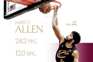 直播吧2月13日讯 今日,骑士官方在社交媒体晒出了球队中锋贾勒特·阿伦过去5场比赛的数据。