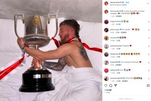 直播吧4月7日讯 毕尔巴鄂竞技球员穆尼亚因在Instagram上晒出了自己抱着国王杯奖杯入睡的照片,庆祝球队赢得国王杯冠军。