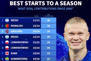 直播吧11月19日讯 哈兰德在本赛季表现抢眼,数据统计显示他各项赛事为俱乐部和国家队已经直接参与35球,《转会市场》统计显示这也是新世纪单赛季同期参与进球第三多的纪录。