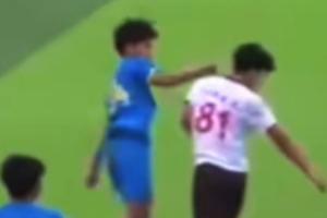打人者为宜宾队的34号何俊杰,比赛尾声阶段宜宾0-4落后自贡,他在背身拿球被对手正常解围后,抡圆了拳头一拳直接打在了防守的自贡队81号苏嘉华的脸上。