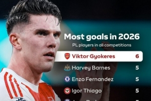 直播吧2月8日讯 在本轮英超,阿森纳3-0击败桑德兰,约克雷斯梅开二度。以下为英超球员在2026年各项赛事进球榜,其中约克雷斯居首。